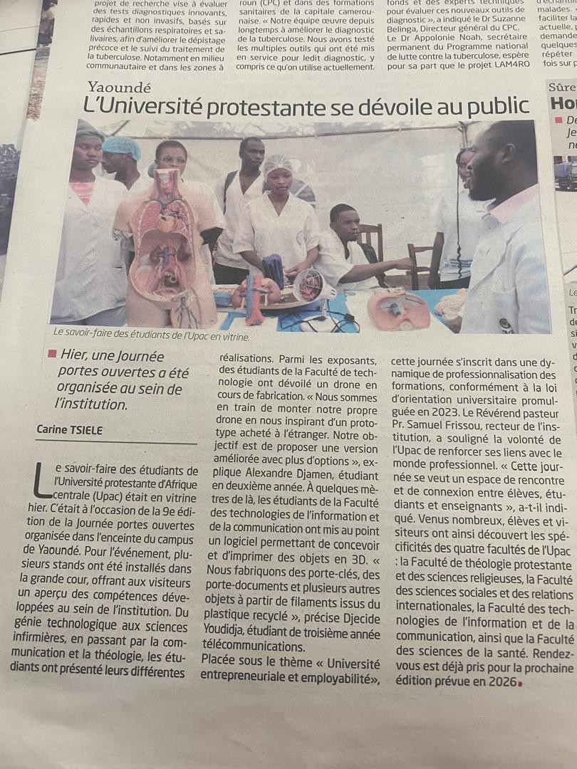 La 9e édition de la Journée Portes Ouvertes confirme la volonté de l’Université Protestante d’Afrique Centrale de s’inscrire dans une dynamique d’amélioration continue de ses manifestations institutionnelles. L’université entend poursuivre ses efforts en vue d’élargir la mobilisation des publics cibles, de renforcer l’attractivité de l’événement et d’accroître son impact dans l’orientation académique et professionnelle des jeunes.