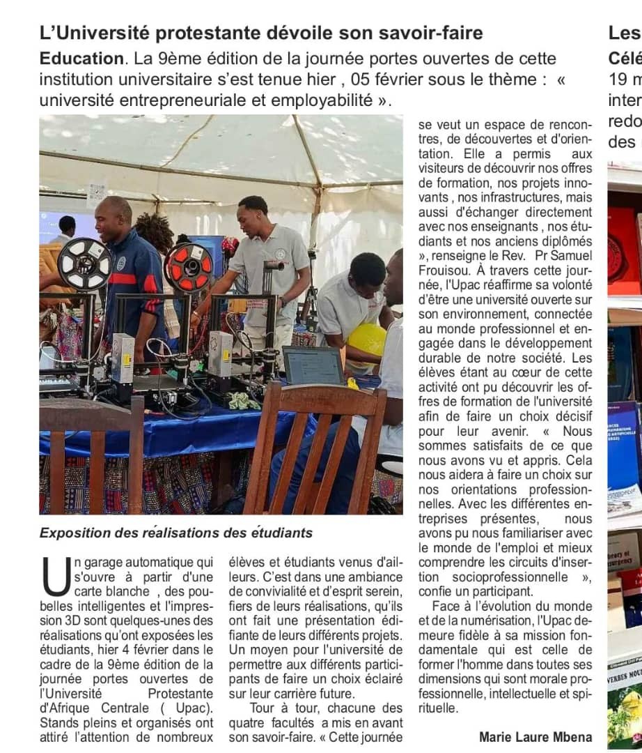 La 9e édition de la Journée Portes Ouvertes de l’Université Protestante d’Afrique Centrale, organisée le 5 février 2026 autour du thème « Université entrepreneuriale et employabilité », s’est affirmée comme un événement stratégique dans la politique de promotion académique et de visibilité institutionnelle de l’établissement. Cette rencontre a offert un cadre privilégié d’échanges entre la communauté universitaire, les élèves du secondaire et les acteurs du monde socio-économique, tout en contribuant au renforcement du positionnement de l’université dans le paysage de l’enseignement supérieur.
