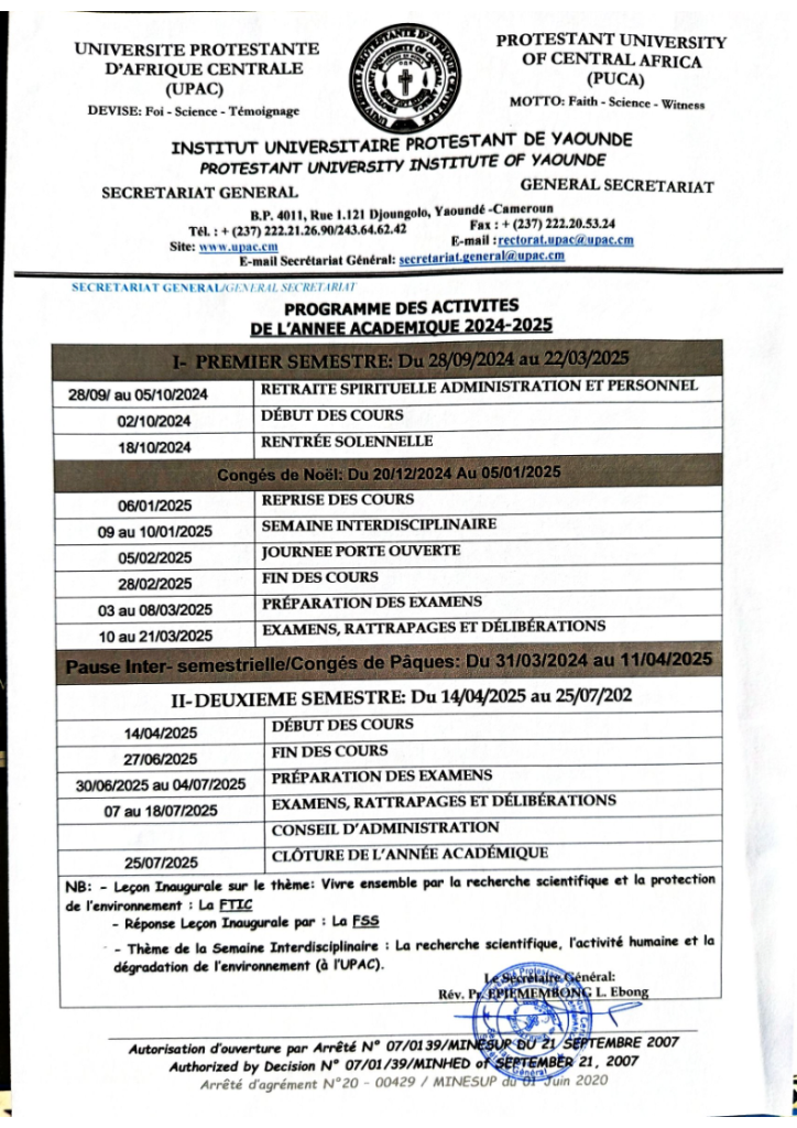 CALENDRIER ACADEMIQUE 2024-2025 UPAC-PUCA