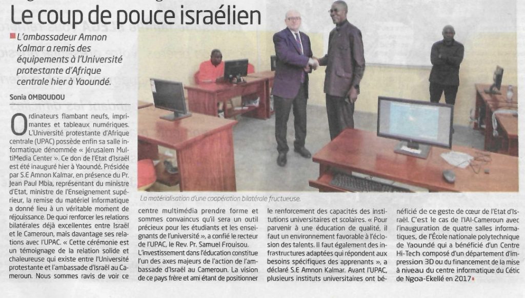 Le 02 décembre 2025, l’Université Protestante d’Afrique Centrale (UPAC) a marqué une avancée décisive dans son processus de modernisation en inaugurant la salle multimédia « Jerusalem Multimedia Center » et en recevant un important don d’équipements informatiques offerts par l’Ambassade d’Israël au Cameroun. Cette journée a confirmé la solidité d’une coopération qui s’impose désormais comme l’un des moteurs de l’innovation technologique et de l’ouverture internationale de l’Université.